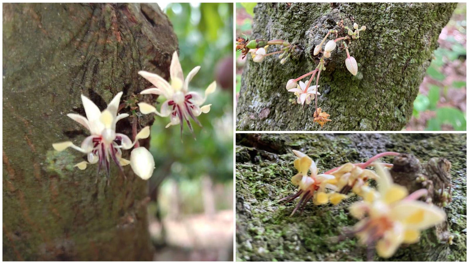 La flor de cacao (Theobroma cacao) es única en su apariencia y ciclo de vida. Tiene una estructura característica, con cinco sépalos exteriores y cinco pétalos internos que son pequeños y tienen un color blanco amarillento. Lo que la distingue es que no crece en ramas o extremidades pequeñas, sino que emerge directamente del tronco principal y las ramas más gruesas del árbol.